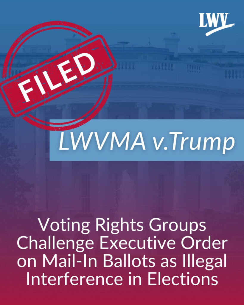 The suit was filed by the League of Women Voters of Massachusetts, the League of Women Voters, Association of Americans Resident Overseas (AARO), US Vote Foundation, OCA – Asian Pacific American Advocates (OCA), and Delta Sigma Theta Sorority, Inc.